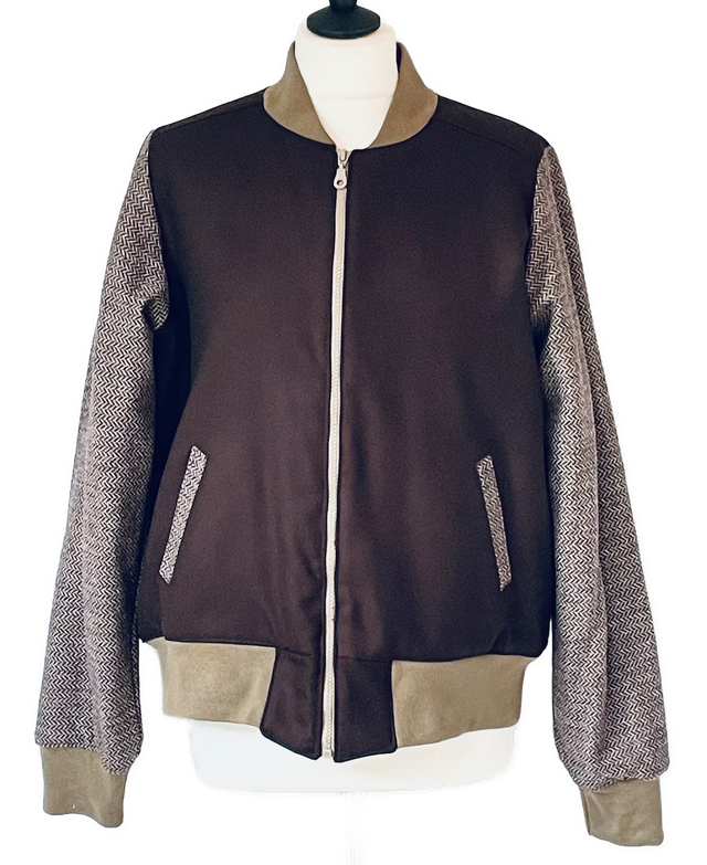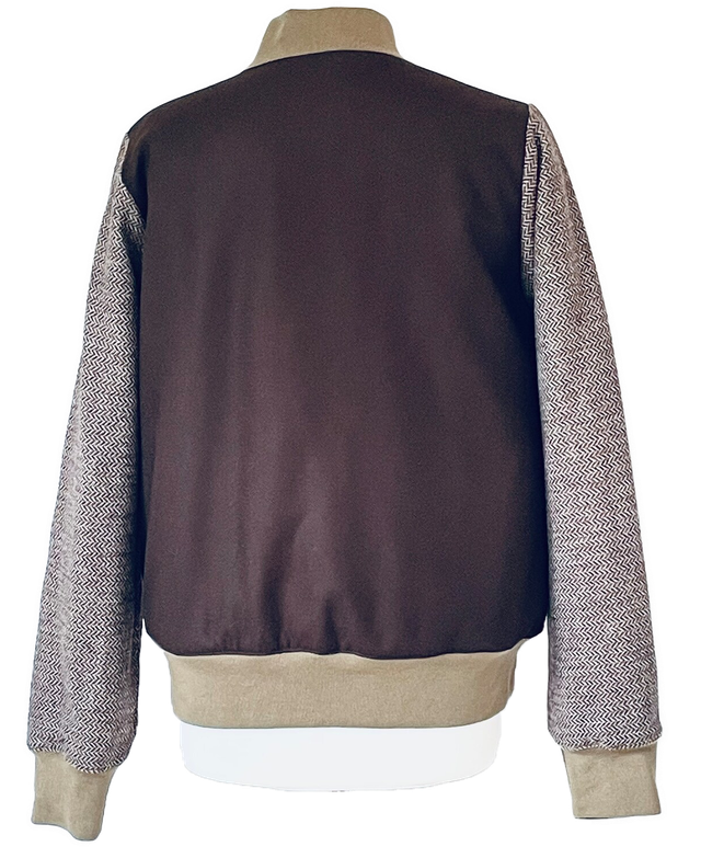 Le bomber est fabriqué dans des tissus de laine en tweed marron et beige et marron uni.