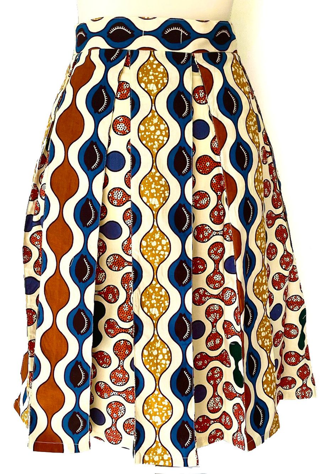 Jupe fabriquée en France - tissu wax aux motifs abstraits bleu, caramel et ocre sur un fond ivoire.