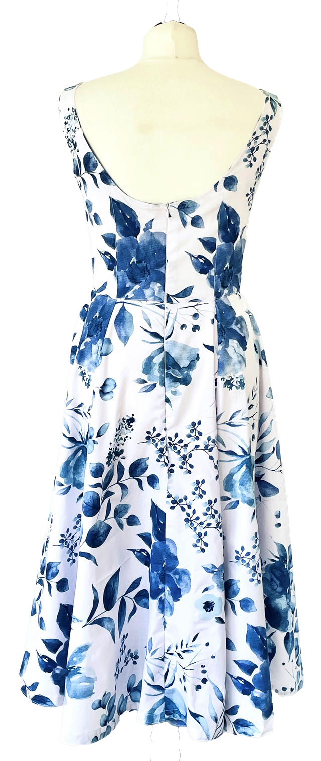 La robe en coton blanc imprimé de grandes fleurs bleues.