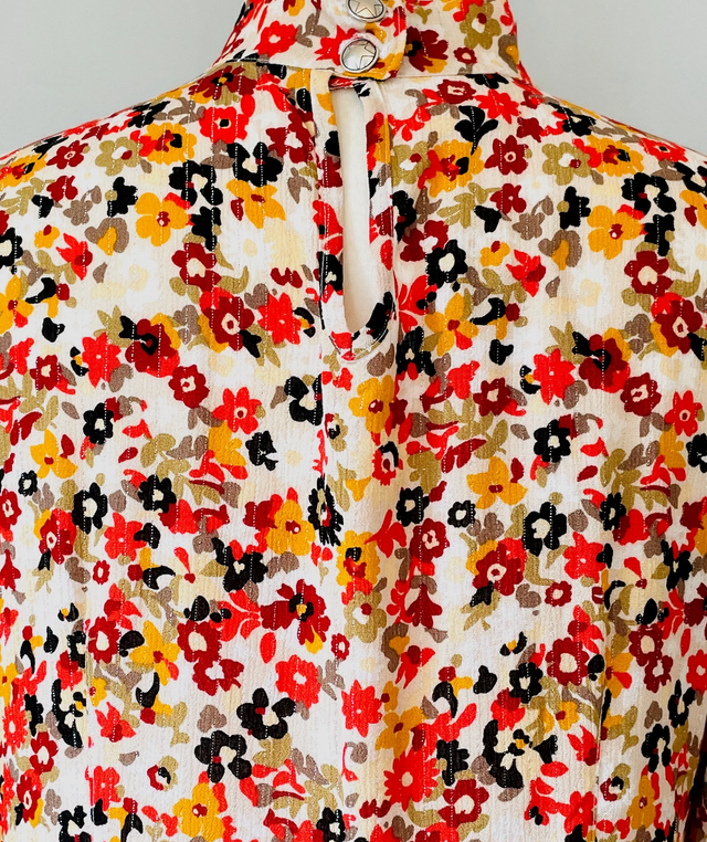 La robe est fabriquée dans un crêpe de viscose imprimé de fleurs oranges, rouges, jaunes et noires sur un fond blanc avec de fines rayures en Lurex argent.