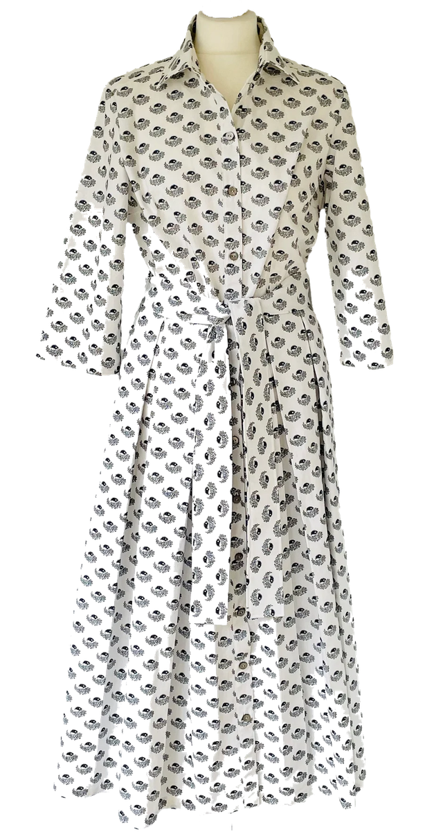 La robe est fabriquée dans un tissu de coton léger de couleur blanc cassé aux motifs provençaux noirs.