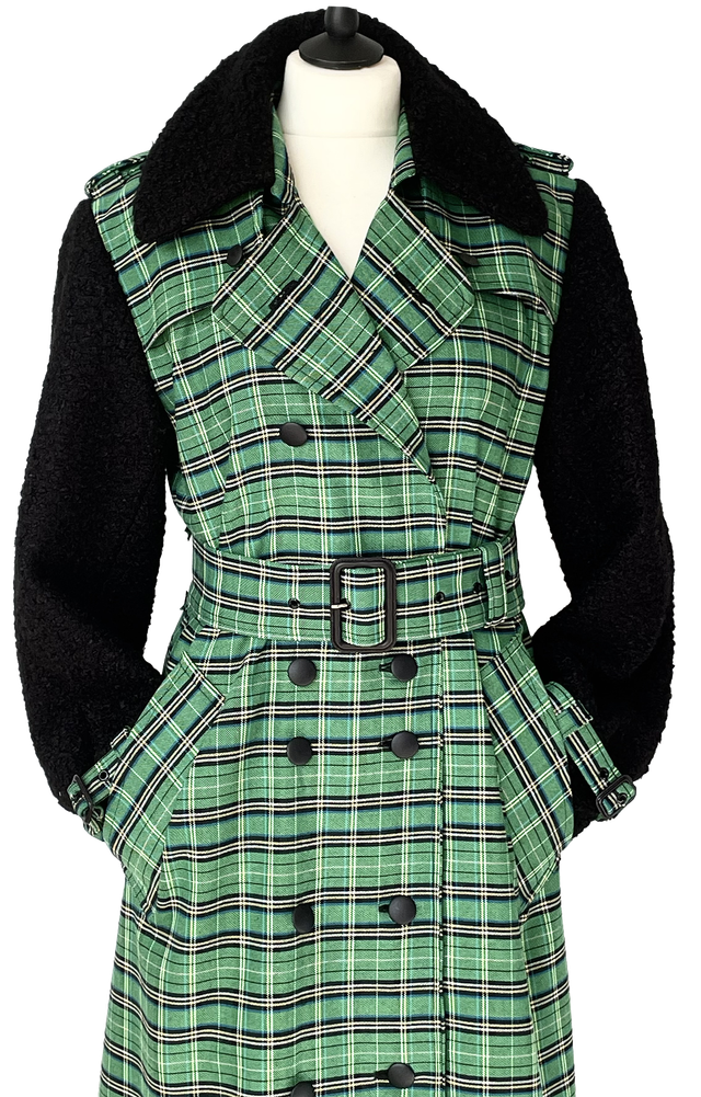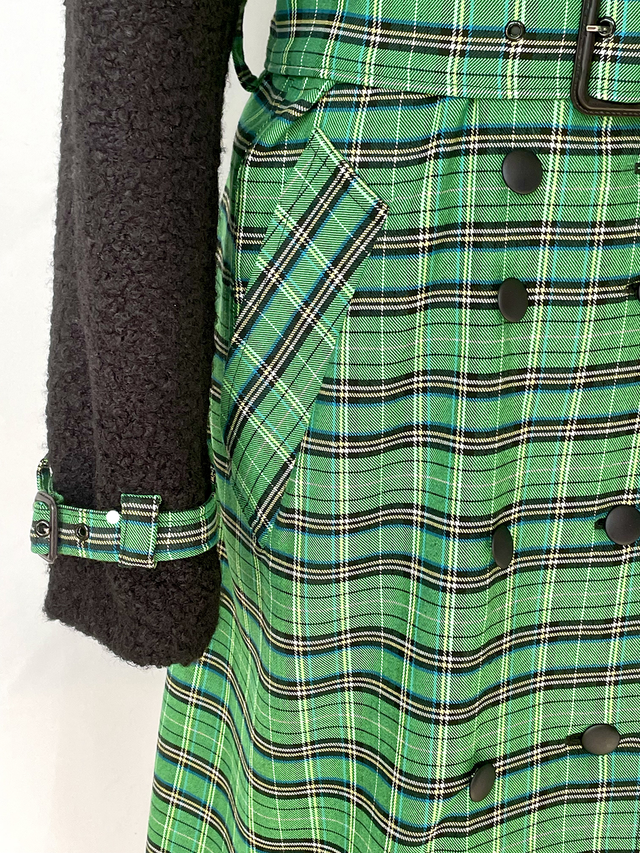 Le trench coat est fabriqué dans un tissu souple de viscose écossais vert et noir.