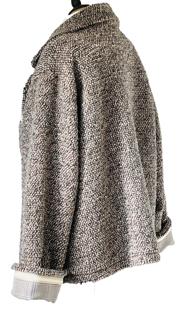 Veste fabriquée en France, tissu tricot de laine de couleur chiné gris et orange.
