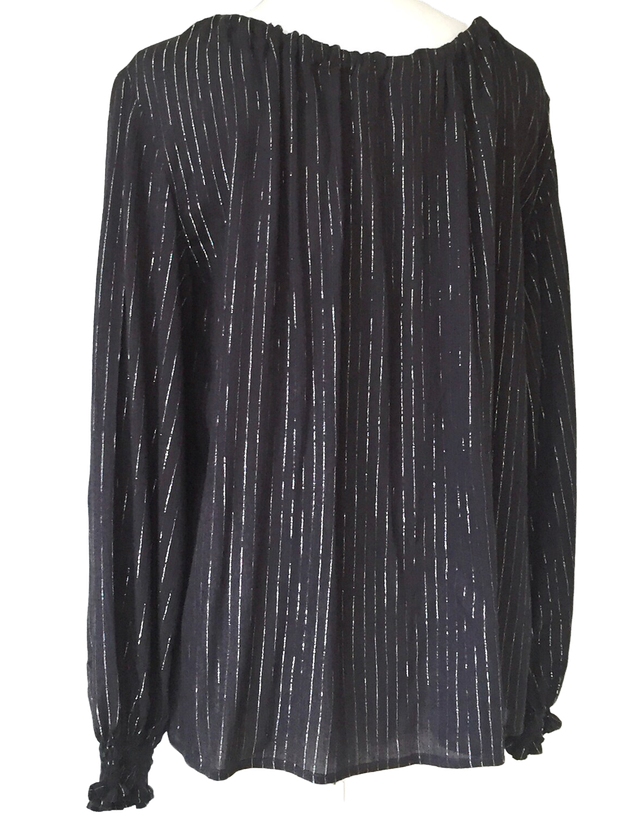 blouse fabriquée en France - tissu crépon de viscose (très léger) bleu nuit à rayures en lurex argent.