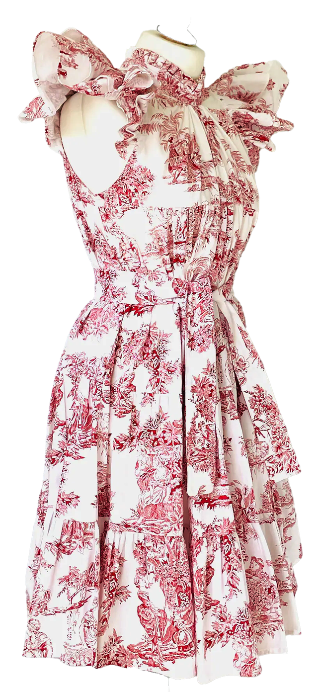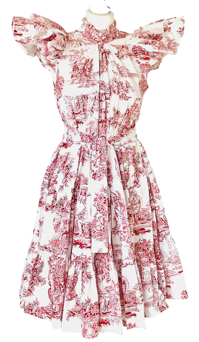 La robe est fabriquée dans un tissu piqué de coton imprimé rouge sur fond blanc toile de Jouy.