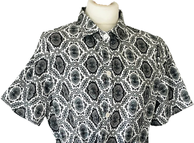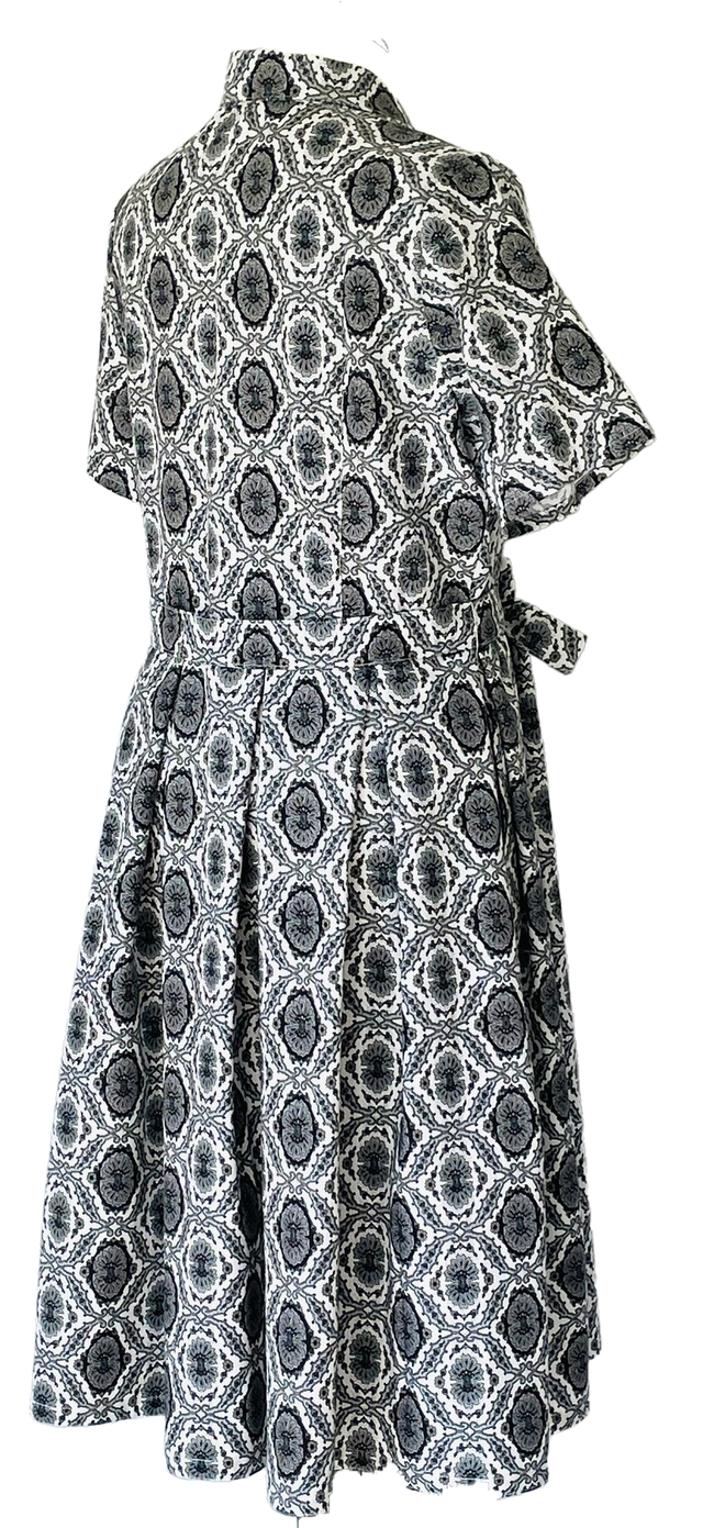 La robe est fabriquée dans un tissu de coton provençal aux motifs abstraits noir et blanc.