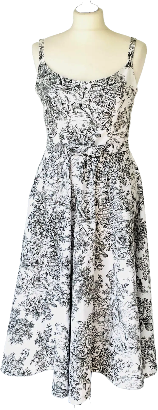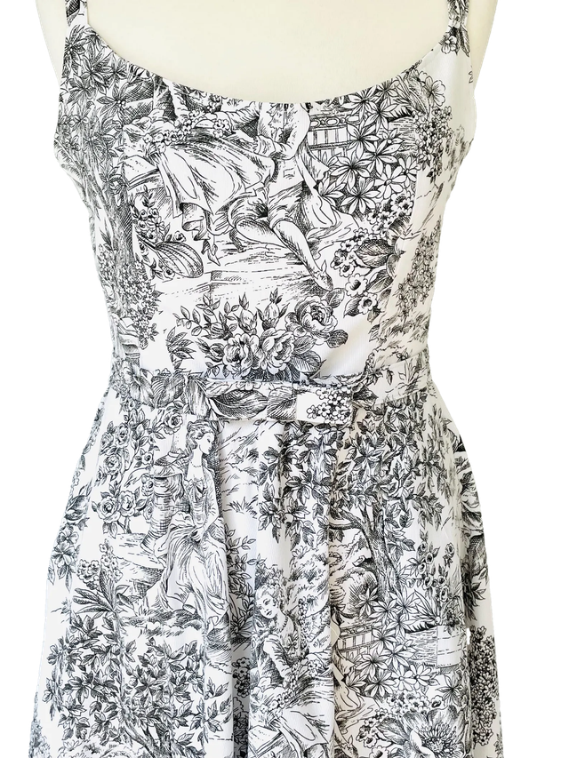 Robe fabriquée dans un tissu 100% coton imprimé de motifs toile de Jouy noir et blanc.